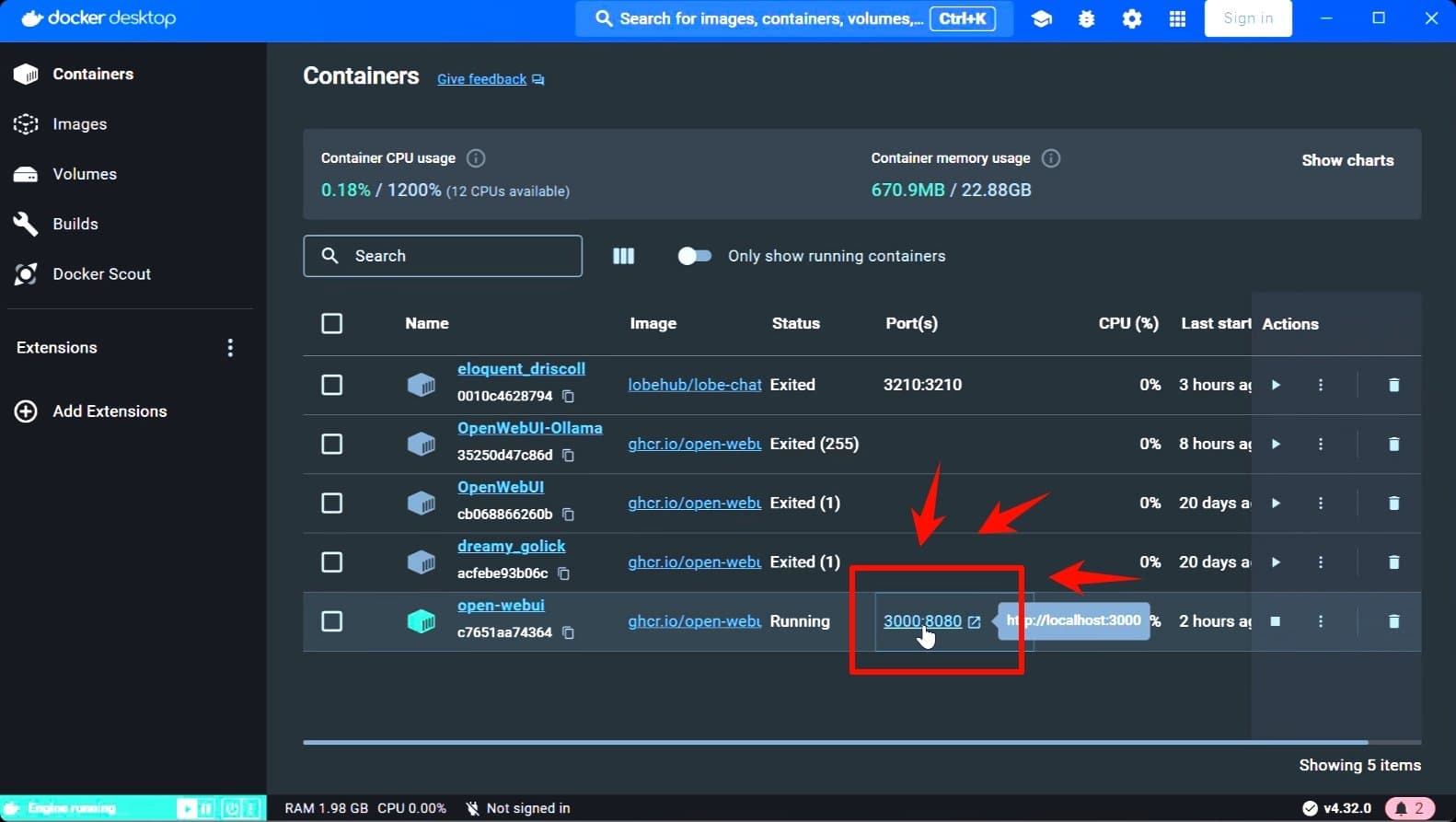 安装搞定后,在docker界面点击3000端口,即可打开Open WebUI