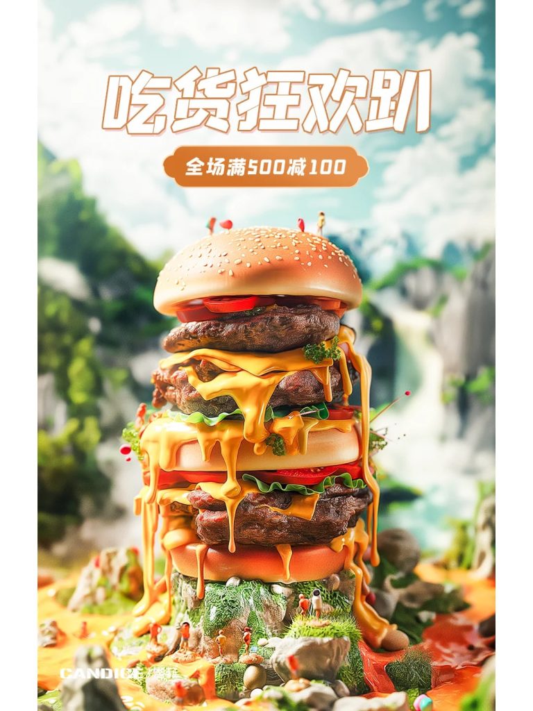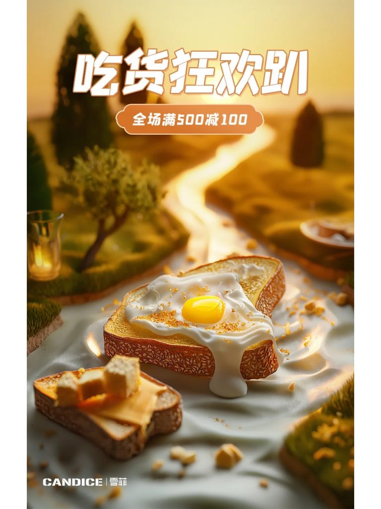 超级梦幻的美食海报来啦,工具:MJ+PS,无论是吐司炸鸡汉堡,还是甜甜圈蛋糕冰淇淋,只要你想,你就能生产这样的炫酷的美食海报,快来试试吧。